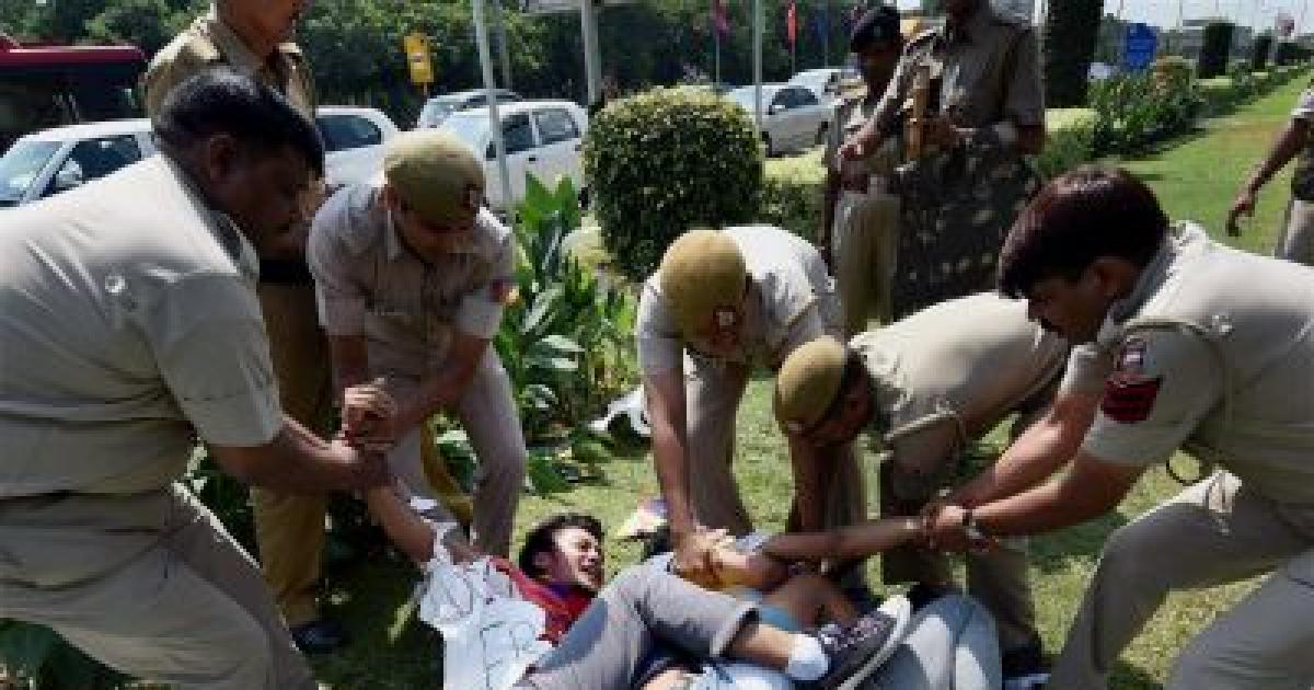 Image: The police detain Tibetan activists protesting against Chinese President Xi Jinping's visit to India outside the Chinese embassy in New Delhi on Wednesday, September 17. Photograph: Kamal Singh, PTI Photo.