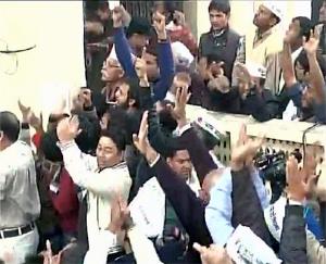 Celebrations outside the AAP office in Delhi.