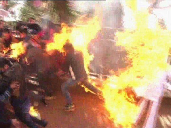 Two Congress workers get serious burn injuries while trying to set PM Modi's effigy on fire.
