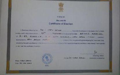 Arvind Kejriwals victory certificate. The election commission hands out the certificates to all winners after the polls, both Lok Sabha and assembly polls.Click on the picture for a larger, but not necessarily clearer image.