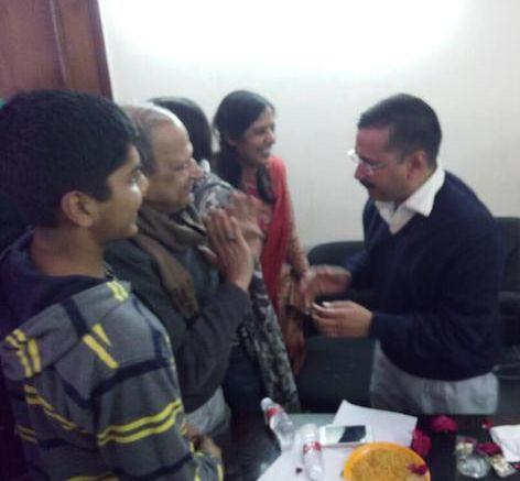Arvind Kejriwal with his son, father and his wife (extreme right) at the party HQ.