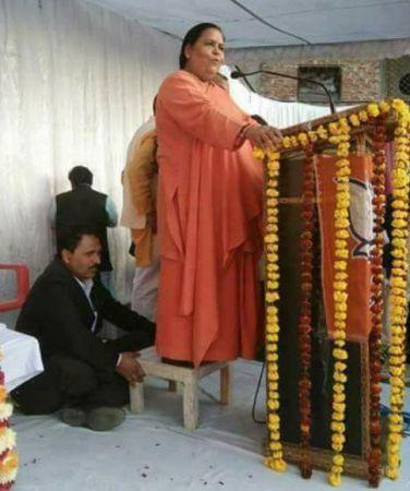 Minister of Water Resources Uma Bharti speaks at a youth conference in Jhansi, even as an aide holds on to the stool she is precariously perched on.