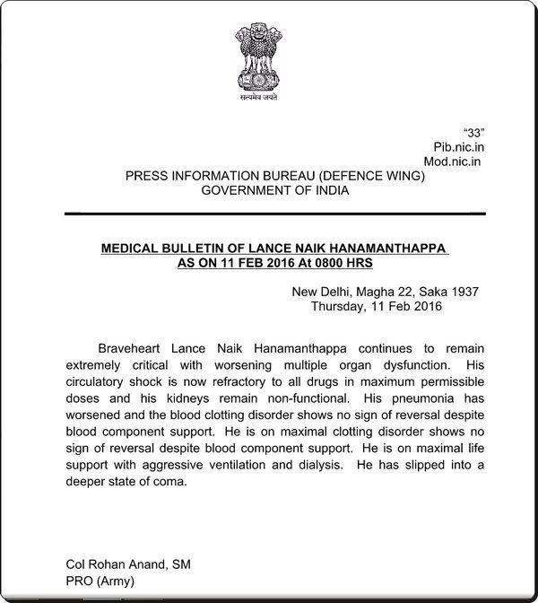 The health bulletin on Lance Naik Hanamanthappa. Click on the picture to enlarge.