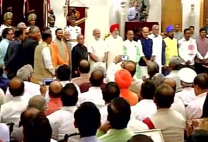 President Pranab Mukherjee and PM Modi with the newly inducted Ministers after the cabinet expansion.