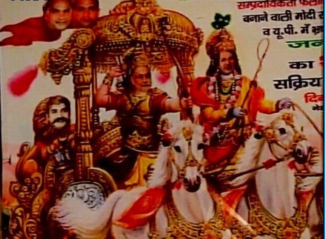 Posters depicting Nitish Kumar as Arjun and Sharad Yadav as Krishna seen in Varanasi ahead of Bihar CM's rally. Photograph: ANI