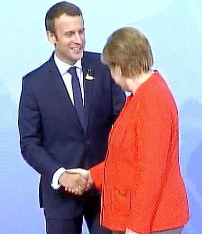 German chancellor Angela Merkel greets French President Emmanuel Macron at the G20 Summit.