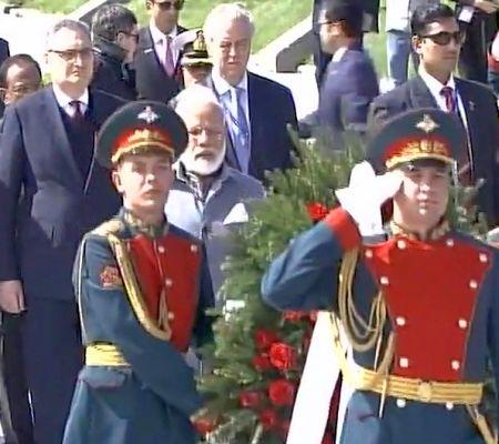 PM Narendra Modi pays homage at Piskaryovskoye Memorial Cemetery in St Petersburg, Russia. The memorial is dedicated mostly to the victims of the Siege of Leningrad.