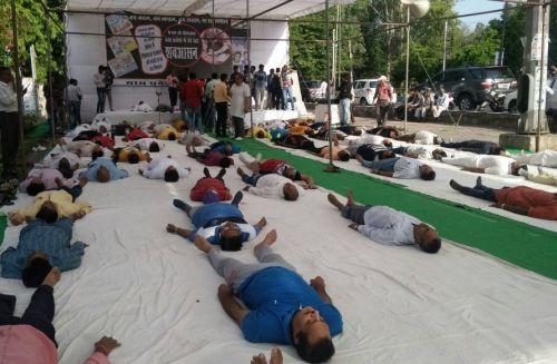 In Bhopal, Congress workers do the Shavaasana on InternationalYoga Day to protest against farmers killed in police firing in Mandsaur, MP.