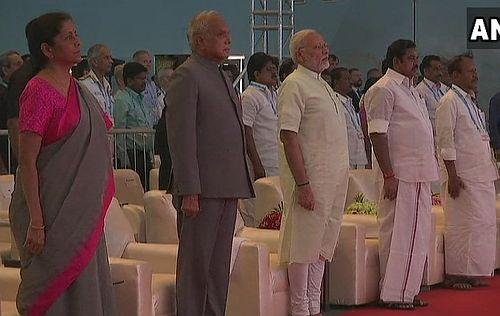 PM Modi at the venue of Defence Expo 2018 in Mahabalipuram. With him are (L to R) Defence Minister Nirmala Sitharaman, Tamil Nadu governor Banwarilal Purohit, CM E Palaniswami and M Thambidurai.