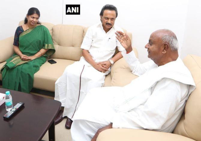 Former prime minister H D Deve Gowda met Dravida Munnetra Kazhagam leaders M K Stalin and Kanimozhi at Kauvery Hospital to inquire about DMK chief M Karunanidhis health. -- ANI
