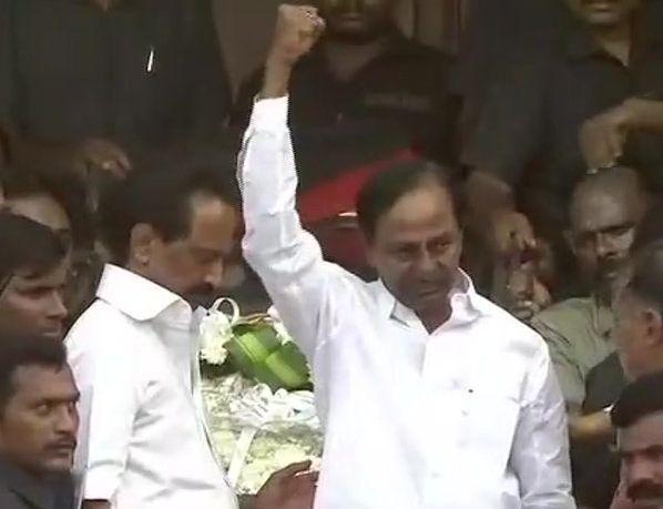Chennai: Chief Minister of Telangana K Chandrasekhar Rao paid tribute to M Karunanidhi at Rajaji Hall.