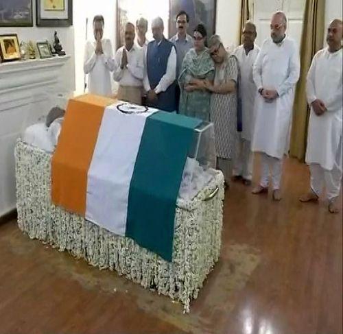 Mortal remains of former PM Atal Bihari Vajpayee wrapped in the tricolour at his residence.