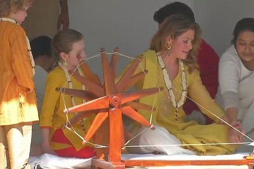 Sophie Gregoire Trudeau spins yarn at the Sabarmati Ashram.