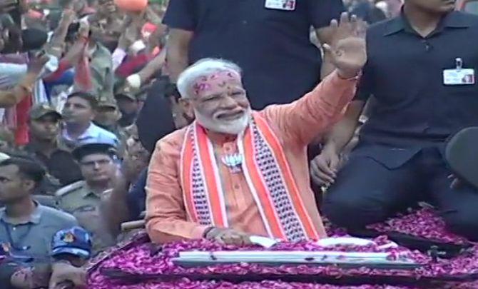 Visuals from Prime Minister Narendra Modi's roadshow in Varanasi. -- ANI