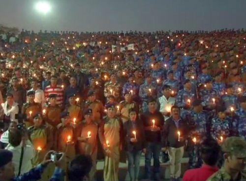 Security personnel and civilians hold a candle march in Bhopal to pay tribute to the soldiers who lost their lives in Pulwama attack