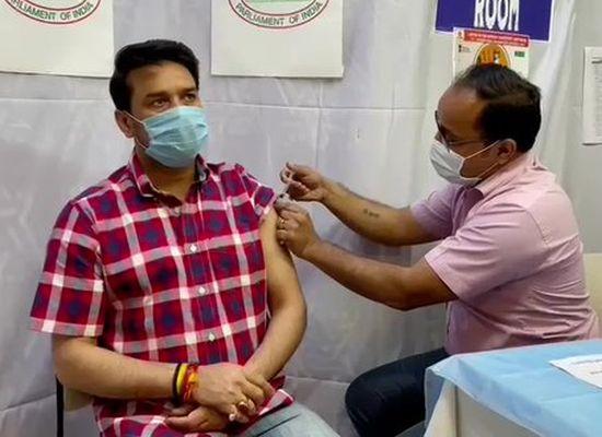 Union Minister Anurag Thakur receives the first dose of COVID-19 vaccine at Parliament House Annexe in New Delhi. Photograph: ANI/Twitter
