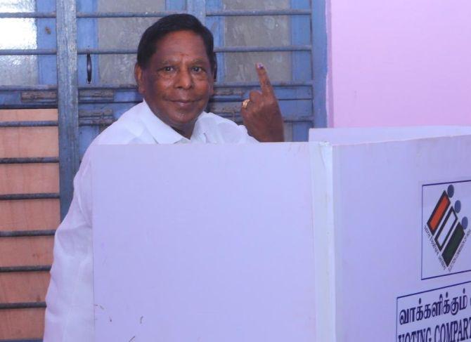 Former Puducherry CM and Congress leader V Narayanasamy casts his vote in Puducherry assembly elections.