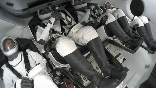 The astronauts inside the capsule. The crew, piloted by India's Group Captain Shubhanshu Shukla will travel to the orbiting laboratory on a new SpaceX Dragon spacecraft after launching on the company's Falcon 9 rocket. The targeted docking time is approximately 7 am EDT on Thursday or 4 pm IST.