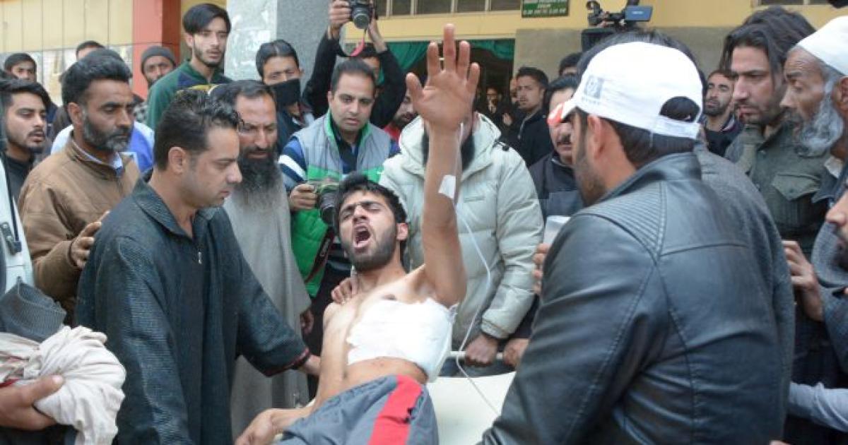 A youth injured in the April 9 violence shouts slogans as he is taken to hospital in Srinagar. Photographs: Umar Ganie