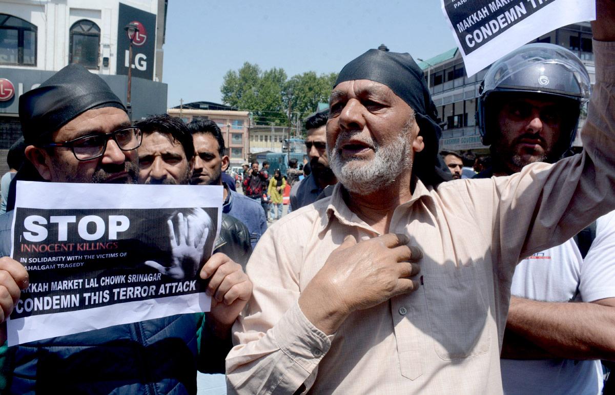 IMAGE: ​​​​​​​Traders protest against the Pahalgam terror attack in which 26 tourists were killed and many were injured, Srinagar, April 23, 2025. Photograph: Umar Ganie for Rediff.com