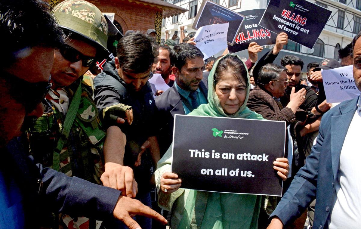 IMAGE: Peoples Democratic Party President Mehbooba Mufti along with party MLA Wahid Parra and senior party leaders protest against the Pahalgam terror attack in which 26 tourists were killed and many were injured, at Ghanta Ghar in Srinagar, April 23, 2025. Photograph: Umar Ganie for Rediff.com