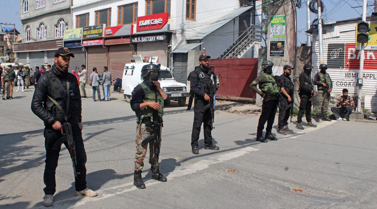 IMAGE: ​​​​​​​Security forces on the alert during the traders protest against the Pahalgam terrorist attack, Srinagar, April 23, 2025. Photograph: Umar Ganie for Rediff.com