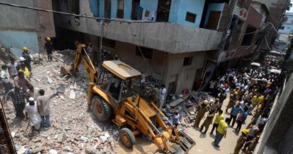 Image: A bulldozer clears the debris while locals look at the collapsed three-storey residential building in Tulsi Nagar area of Inderlok, New Delhi on Saturday. Photograph: PTI