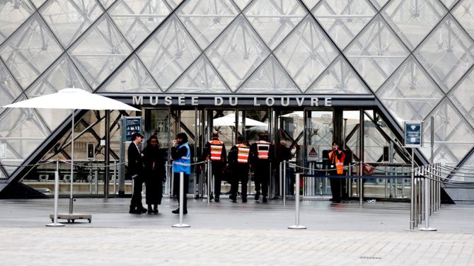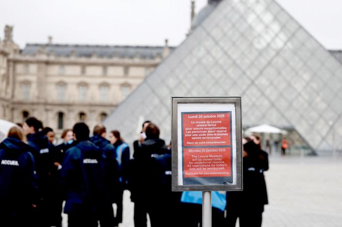IMAGE: A placard which reads 'The Louvre Museum will be closed today for exceptional reasons' is seen near the glass pyramid. Photograph: Benoit Tessier/Reuters