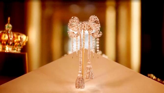 IMAGE: A jewel-encrusted brooch worn by French Empress Eugenie, which was among the items stolen by thieves, on display in this undated still frame from a video. Photograph: Louvre Museum/Handout via Reuters