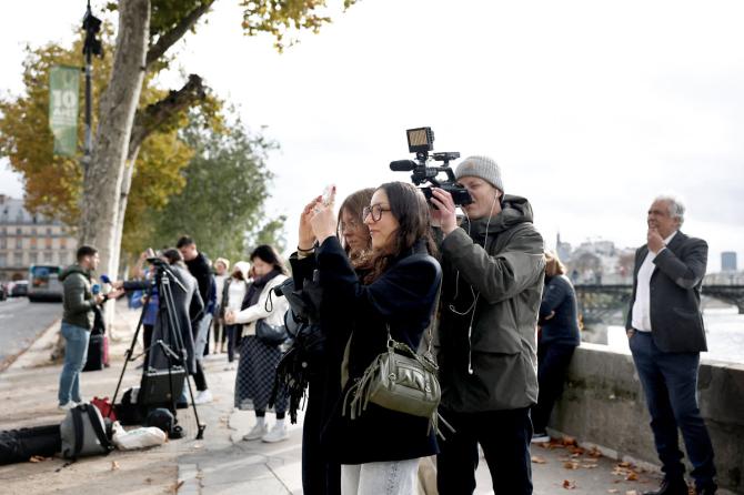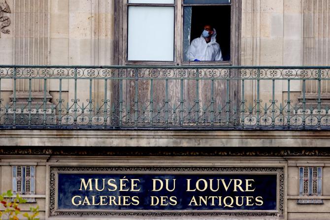 IMAGE: Journalists work as people take picture near the Louvre as the museum remains closed. Photograph: Benoit Tessier/Reuters