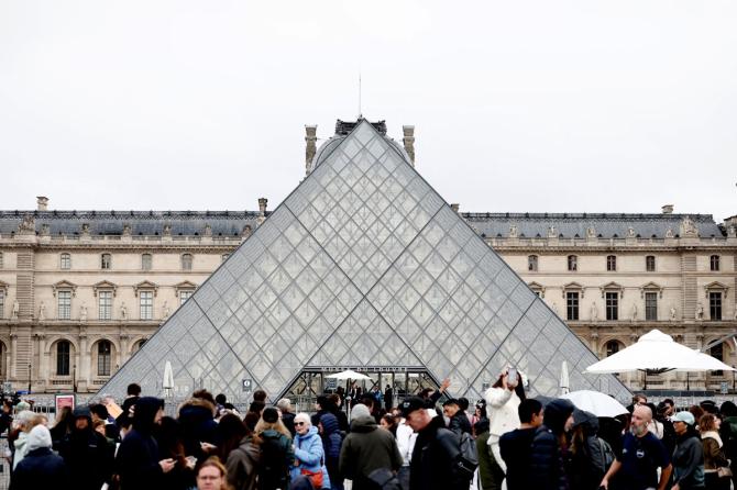IMAGE: Visitors stand near the glass pyramid of the Louvre. Photograph: Benoit Tessier/Reuters