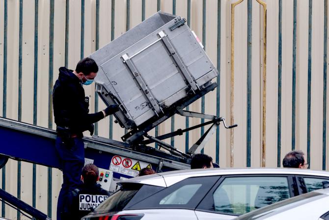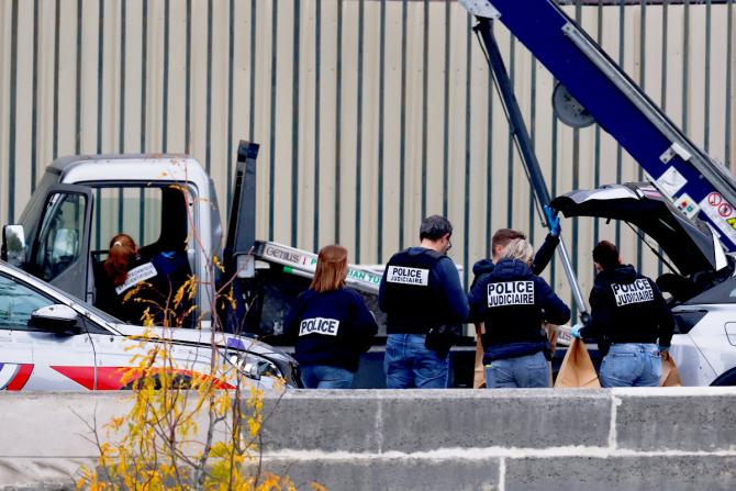 IMAGE: Police officers work at a crane believed to have been used in the heist, here and below. Photograph: Gonzalo Fuentes/Reuters