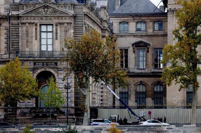 IMAGE: A police vehicle stands near the entrance to the Louvre after the robbery. Photograph: Gonzalo Fuentes/Reuters
