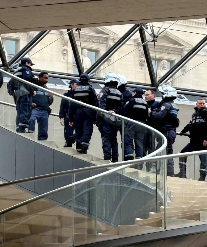 IMAGE: Police gather on the Louvre pyramid spiral staircase after the theft of Napoleon collection jewellery pieces at the museum, in this picture obtained from social media. Photograph: Joan Carpenter Maccracken via Reuters