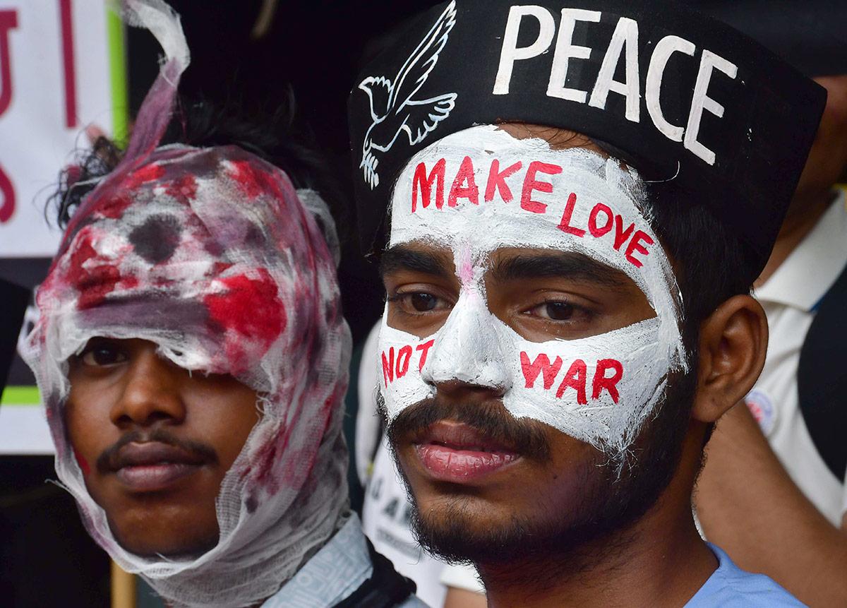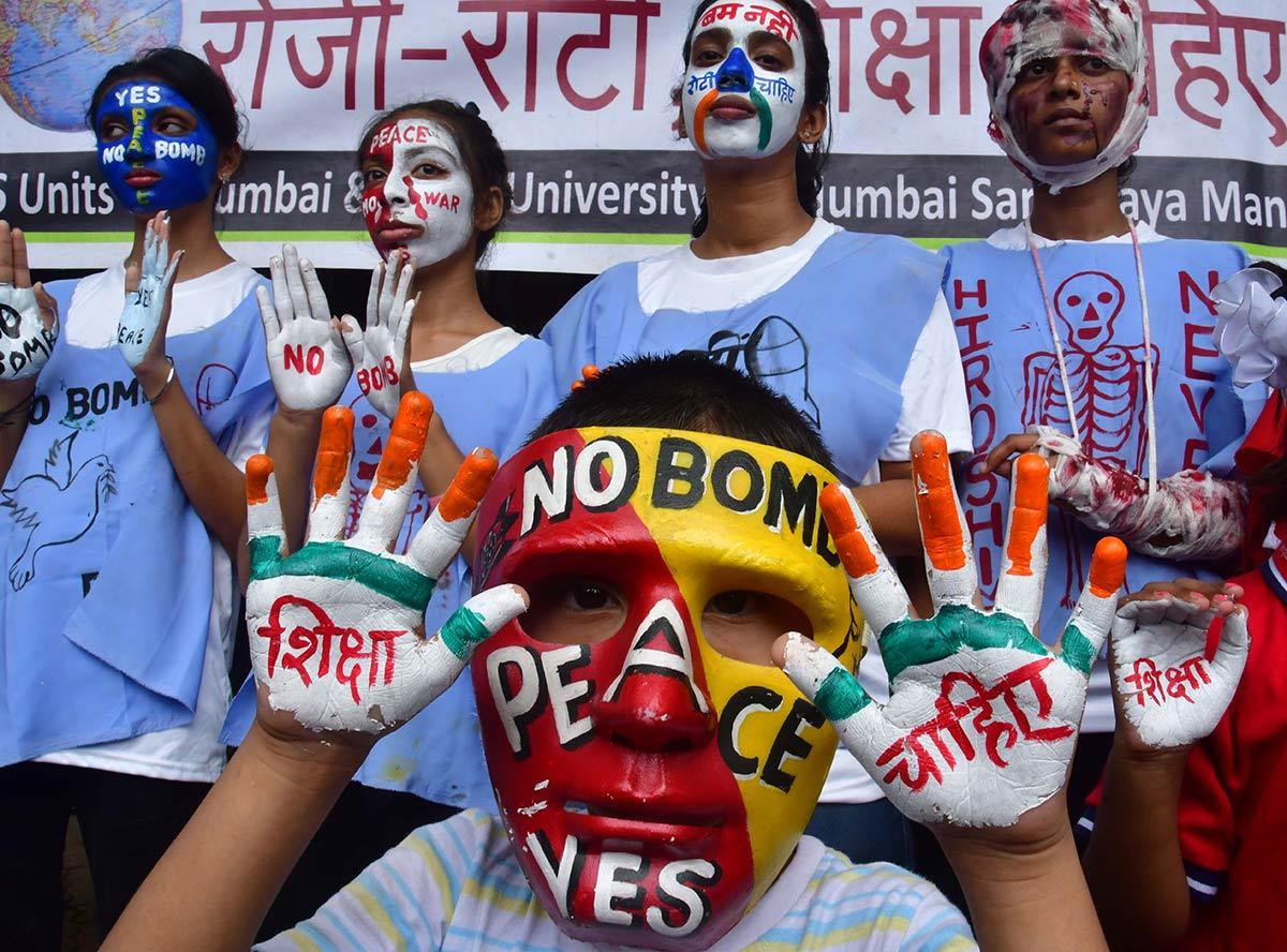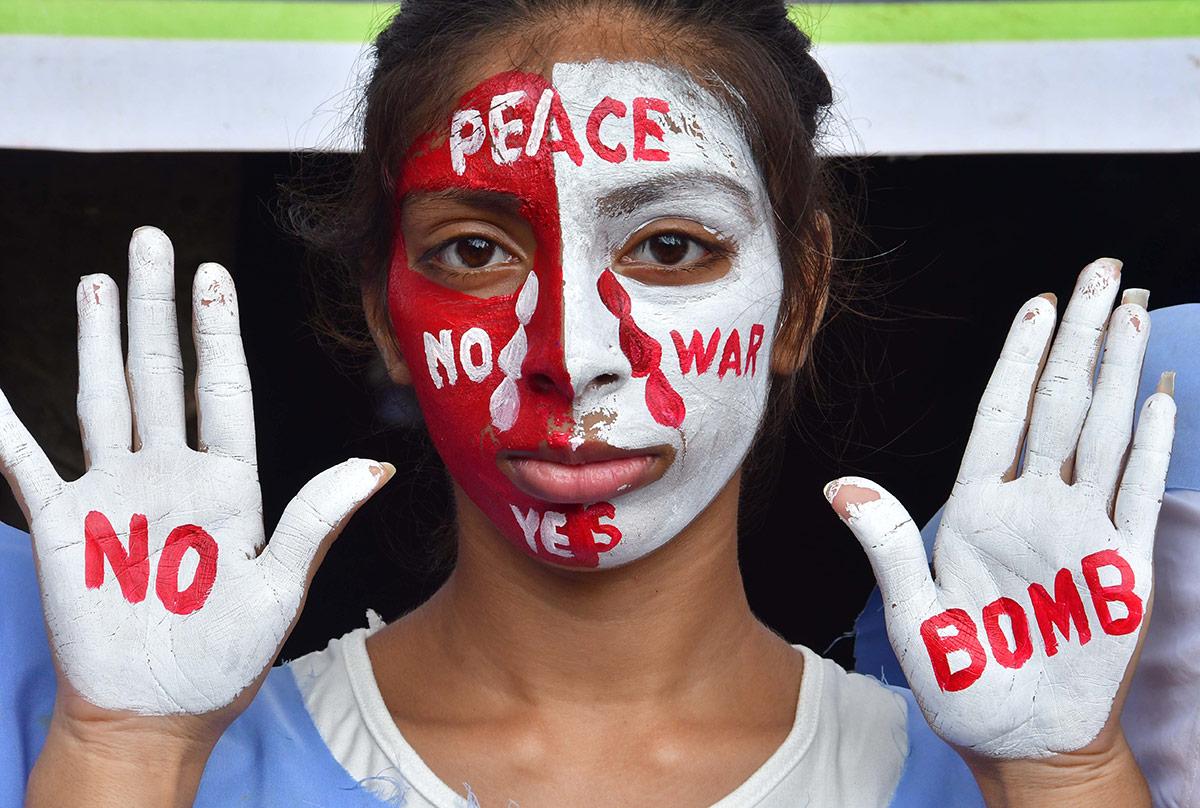 IMAGE: A student with her face painted 'Peace No War' to mark the 80th anniversary of the world's first atomic bomb attack on Hiroshima at the end of World War II, at a peace rally in Mumbai. Photograph: Sahil Salvi