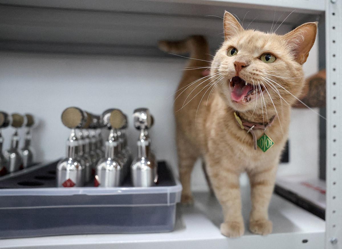 IMAGE: A cat reacts near a container with microphones at the factory of the Soyuz Microphones company in the city of Tula, Russia.