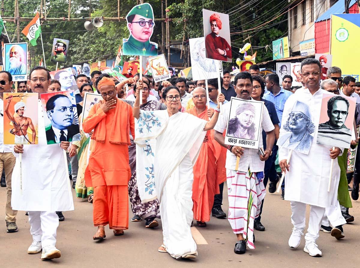IMAGE: West Bengal Chief Minister Mamata Banerjee along with Kolkata Mayor Firhad Hakim and others leads a protest against alleged branding of migrants as 'Bangladeshis' and demanding the protection of Bengali identity and language in Jhargram. Photograph: ANI Photo