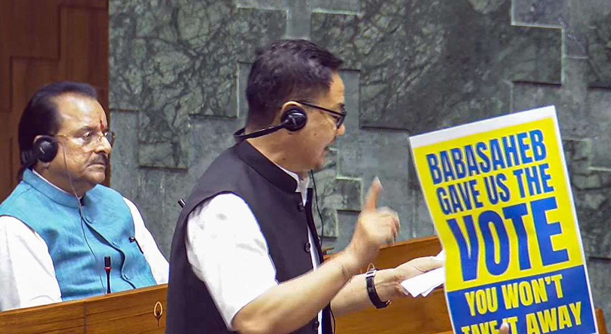 IMAGE: Union Minister Kiren Rijiju speaks in the Lok Sabha with a poster that says it all. Photograph: Sansad TV/ Video Grab/ANI Photo