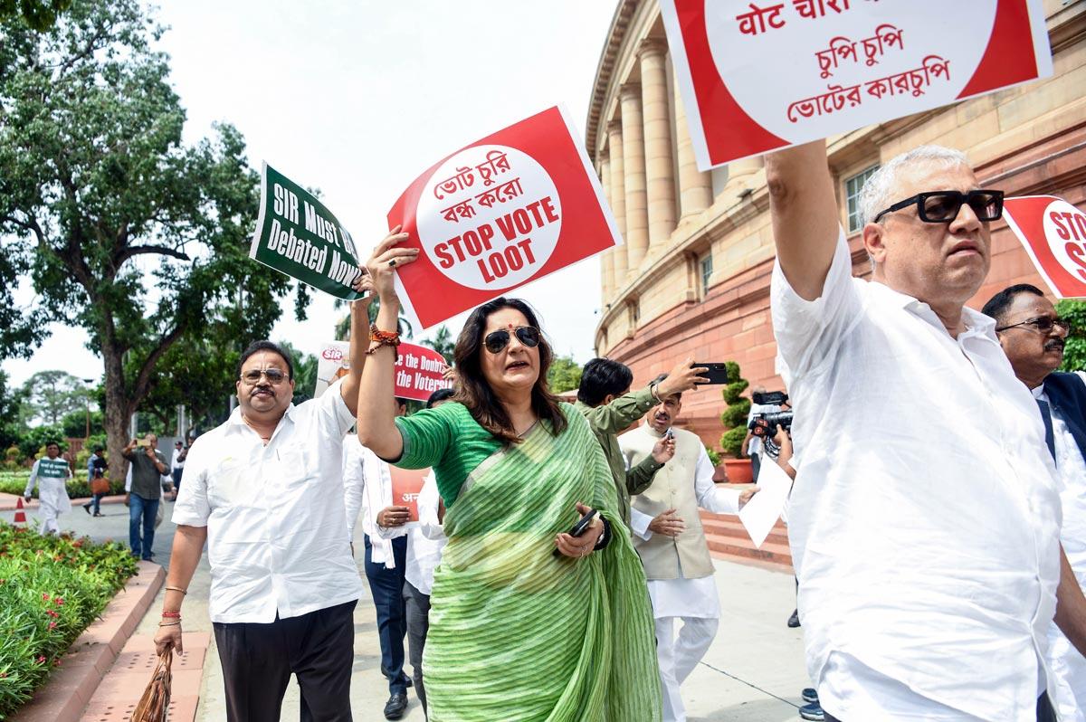 IMAGE: Shiv Sena (UBT) MP Priyanka Chaturvedi, TMC MP Derek O'Brien and other Opposition MPs protest against the Special Intensive Revision of electoral rolls in Bihar outside Parliament. Photograph: Rahul Singh/ANI Photo