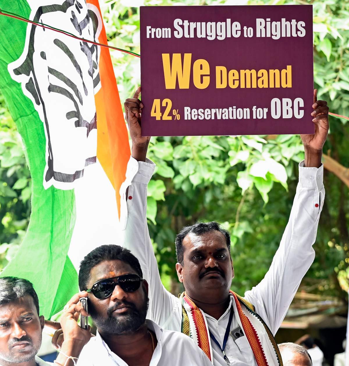 IMAGE: A Congress protest seeking 42% OBC reservation in Telangana's local body elections at Jantar Mantar in New Delhi. Photograph: ANI Photo