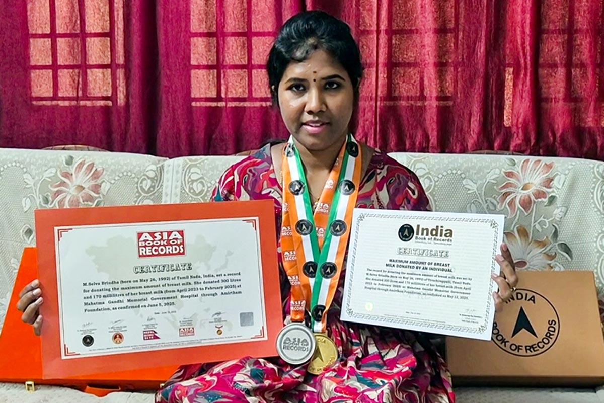 IMAGE: Selva Brindha, a 33-year-old homemaker from Kattur in Tamil Nadu's Trichy district, who has donated 300.17 litres of breast milk over a span of 22 months, earns an entry in the India Book of Records and the Asia Book of Records as the highest breast milk donor in India. Photograph: Video Grab/ANI Photo