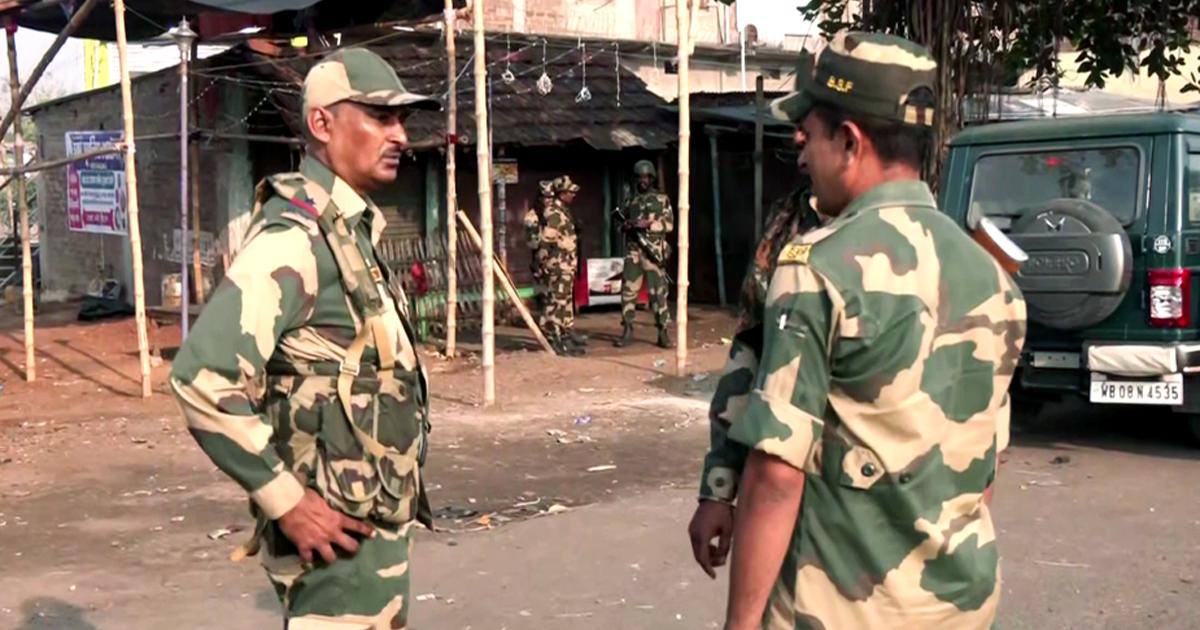 IMAGE: Security personnel stand guard after violent protests against the Waqf (Amendment) Act, at Dhuliyan in Murshidabad, West Bengal, April 12, 2025. Photograph: ANI Photo