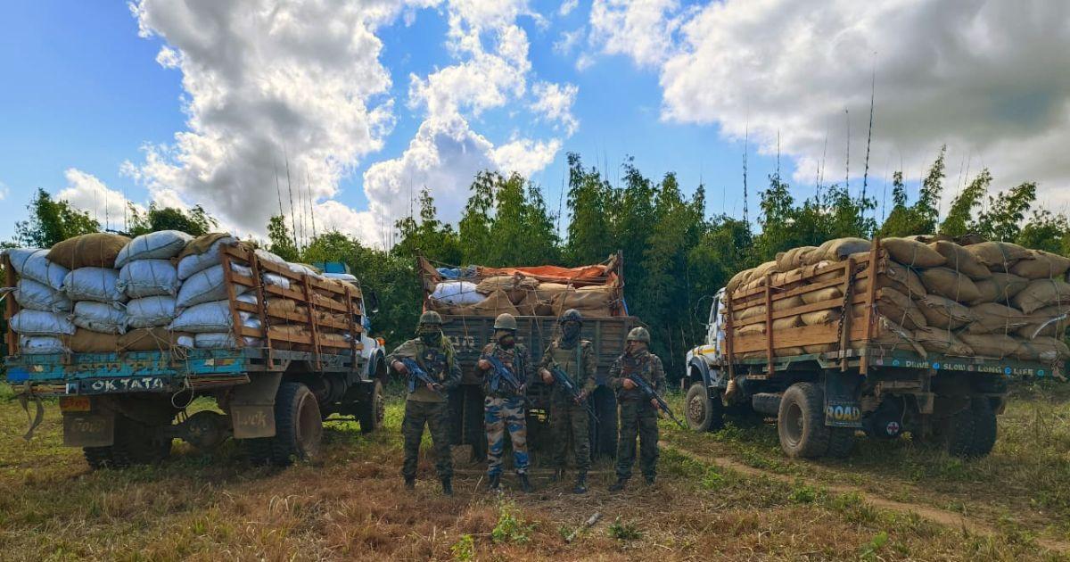 IMAGE: Assam Rifles at the Indo-Myanmar border intercepted three vehicles loaded with Areca nuts worth Rs 83.16 lakh at milestone 20 near Ch Tengnoupal Village in Chandel District on December 28, 2023. Photograph: ANI Photo