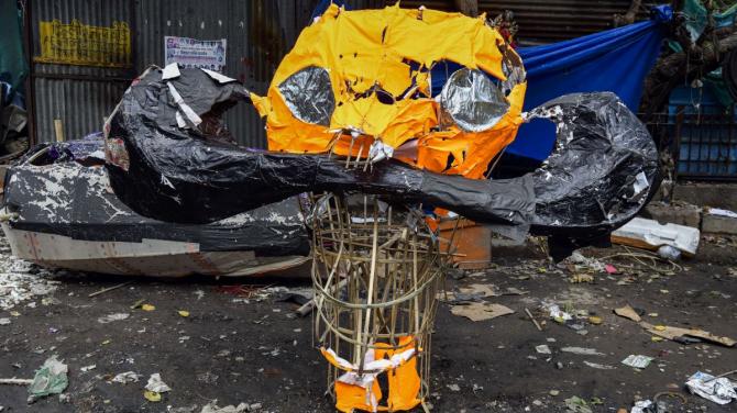 The images are the same though - as is the sense of disbelief. Soaked and broken torsos, limbs, demon heads and intricately woven bamboo frames lie damaged and bent, crowding the dividers and pavements. Much of the paint has been washed away.
