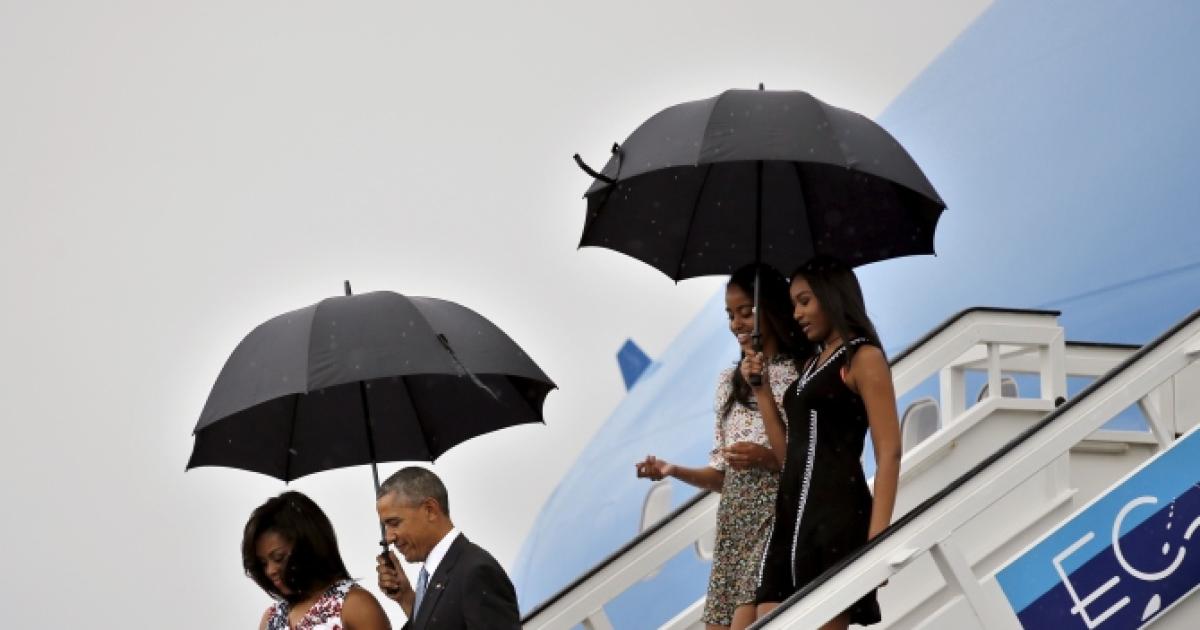 IMAGE: US President Barack Obama, his wife Michelle, and their daughters Malia and Sasha, exit Air Force One as they arrive at Havana's international airport for a three-day trip, in Havana. All photographs: Carlos Barria/Reuters