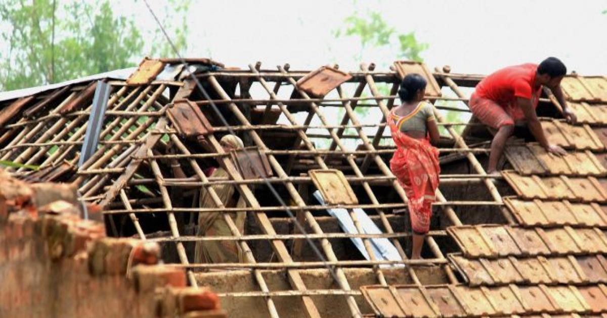 Image: A family repairs their shattered roof in Purnia on Wednesday, a day after a powerful storm. Photograph: PTI