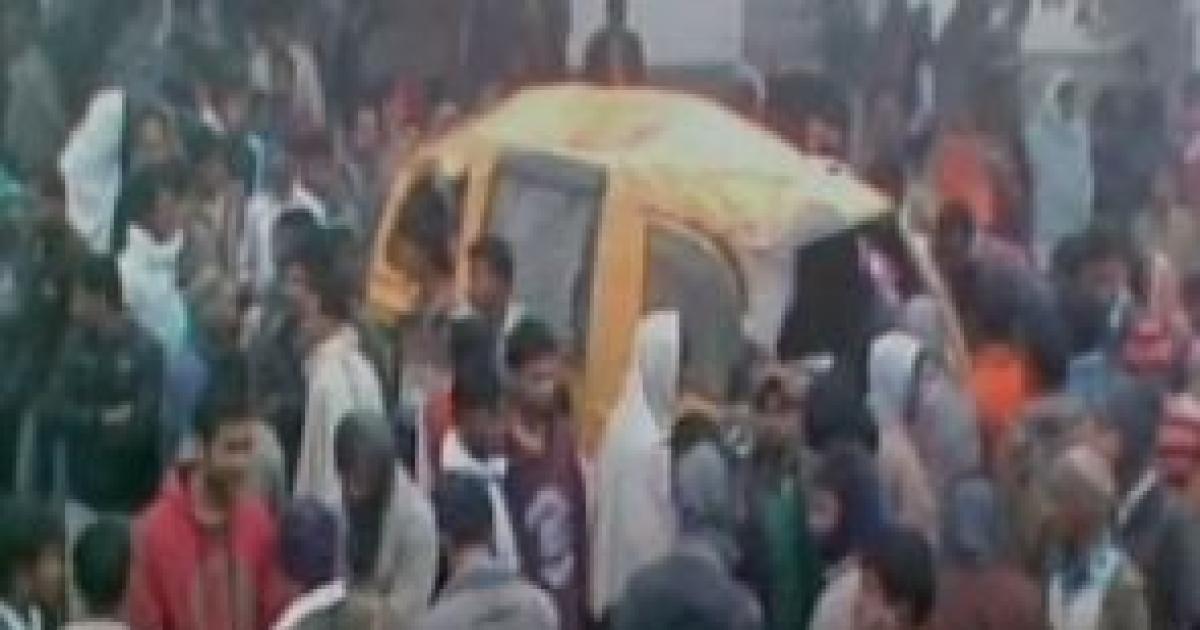 Image: Crowds gather around the van that hit a train in Mau district in Uttar Pradesh. Photograph: ANI/Twitter