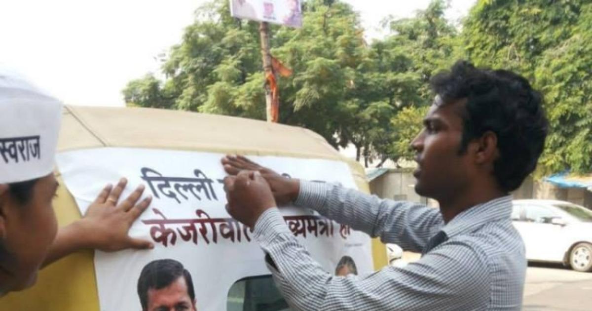 Image: AAP supporters put up posters depicting results of poll surveys of the last election on a rickshaw in Delhi. Photographs: Courtesy: AAP/Facebook