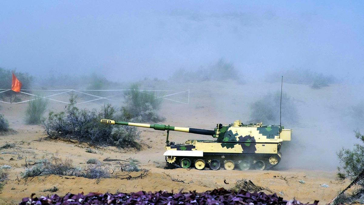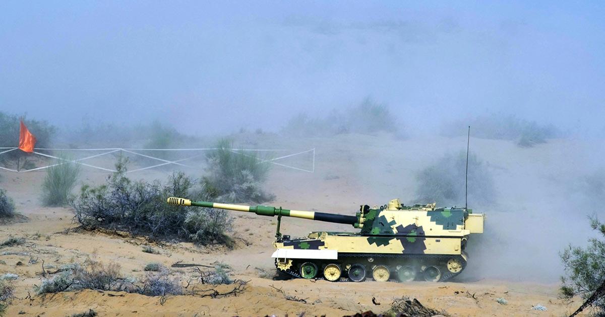 IMAGE: A tank maneuvers through the desert during the Thar Shakti demonstration. Photograph: @SpokespersonMoD X/ANI Photo