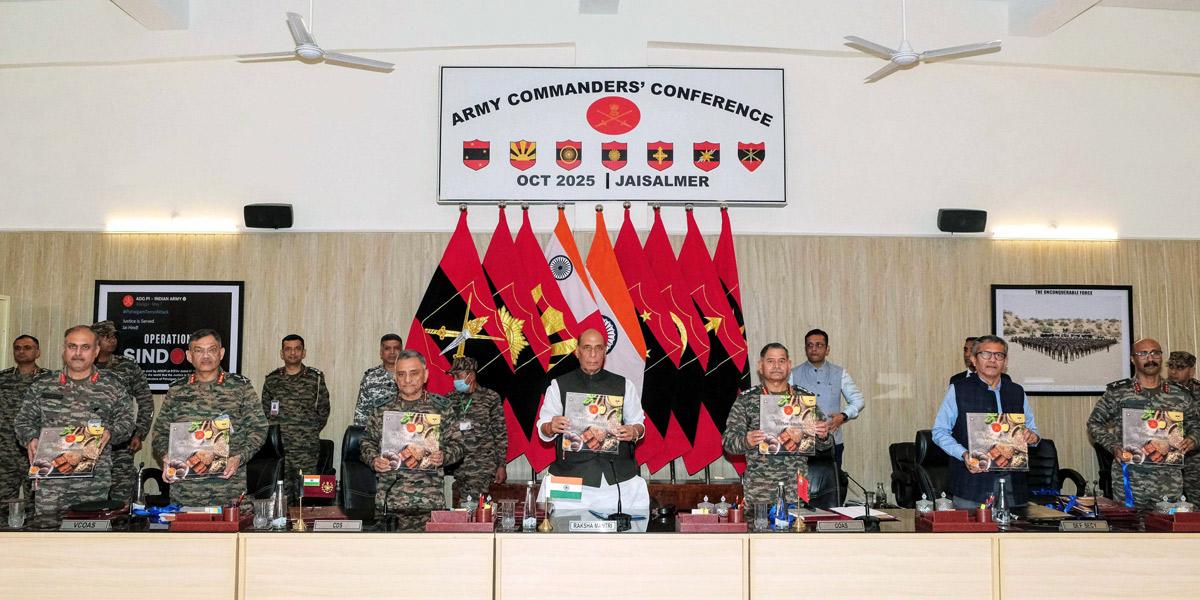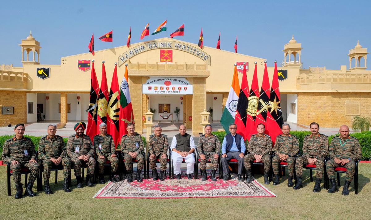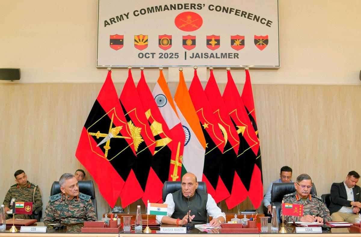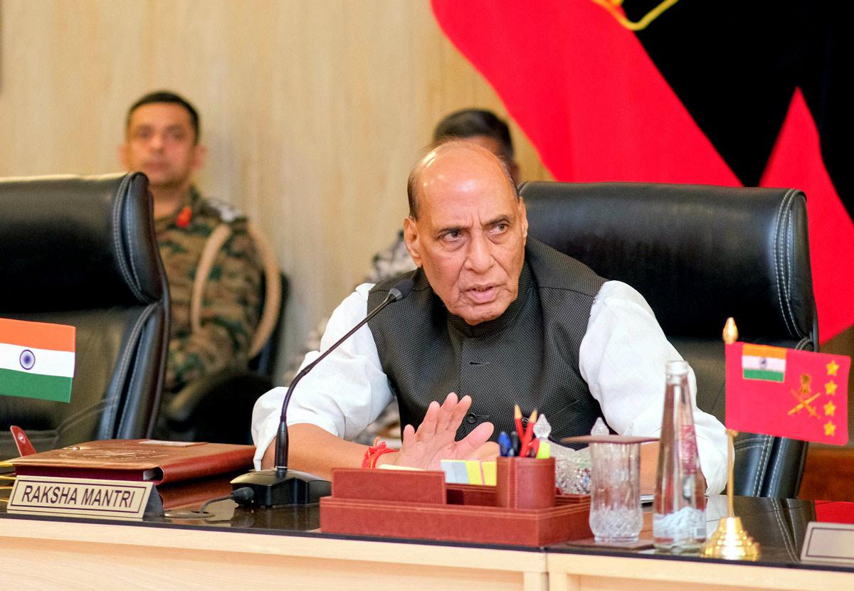 IMAGE: Rajnath Singh speaks at the army commanders conference. Photograph: @SpokespersonMoD X/ANI Photo